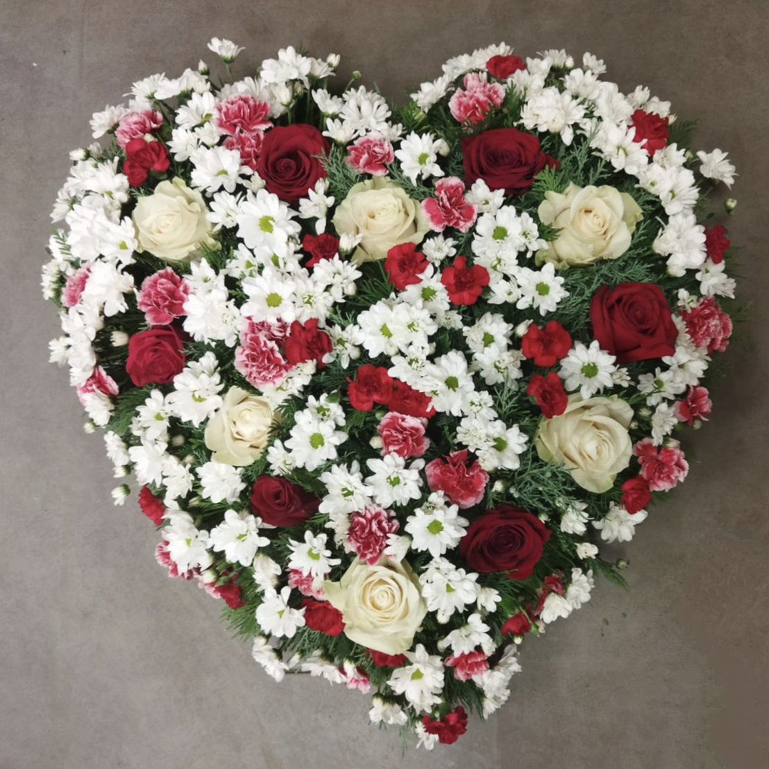 Vyjádřete své city tímto červenobílým smutečním věncem z růží, chryzantém a karafiátů. Přináší útěchu a naději v těžkých chvílích.